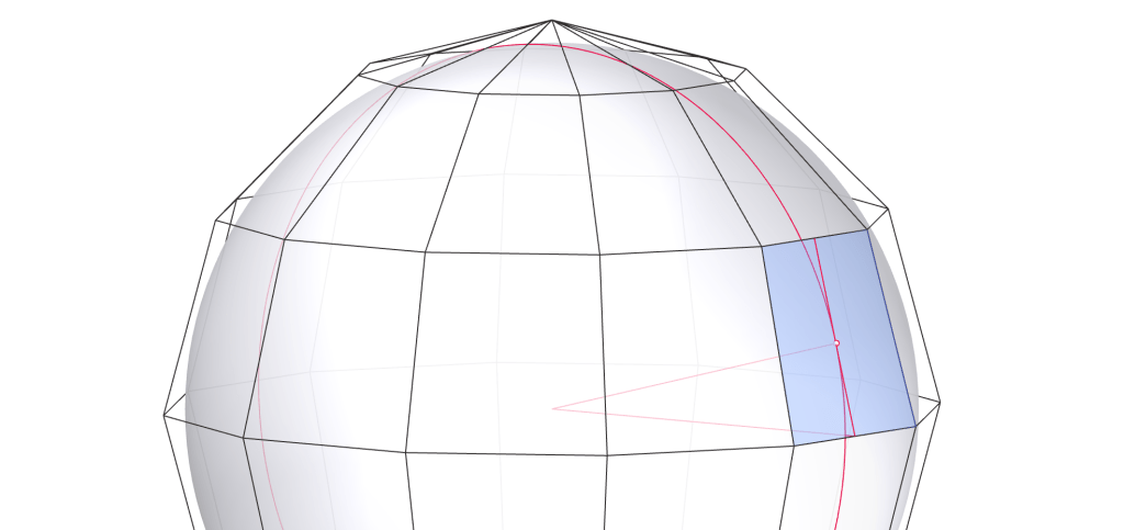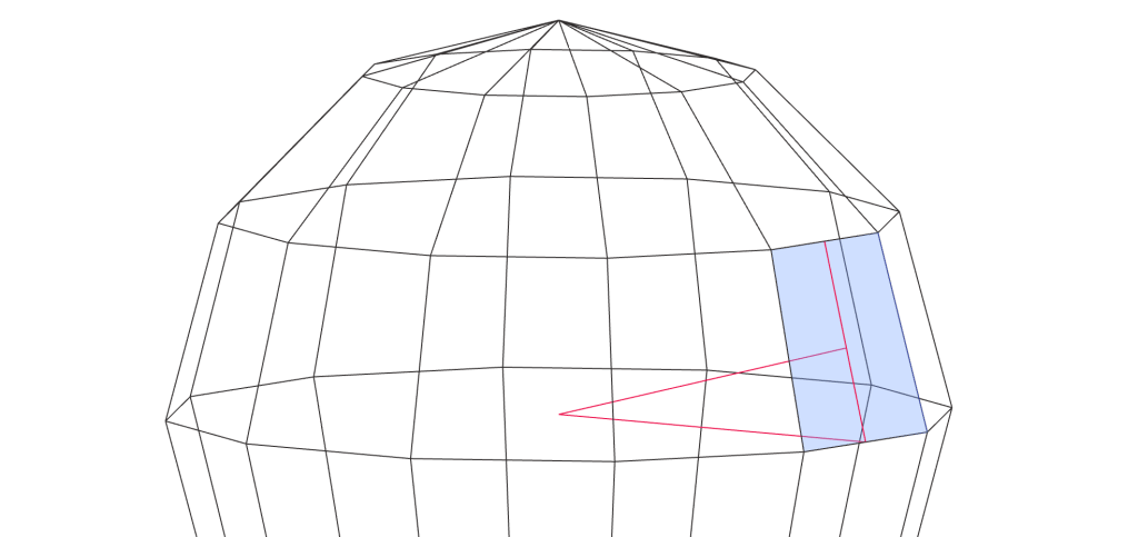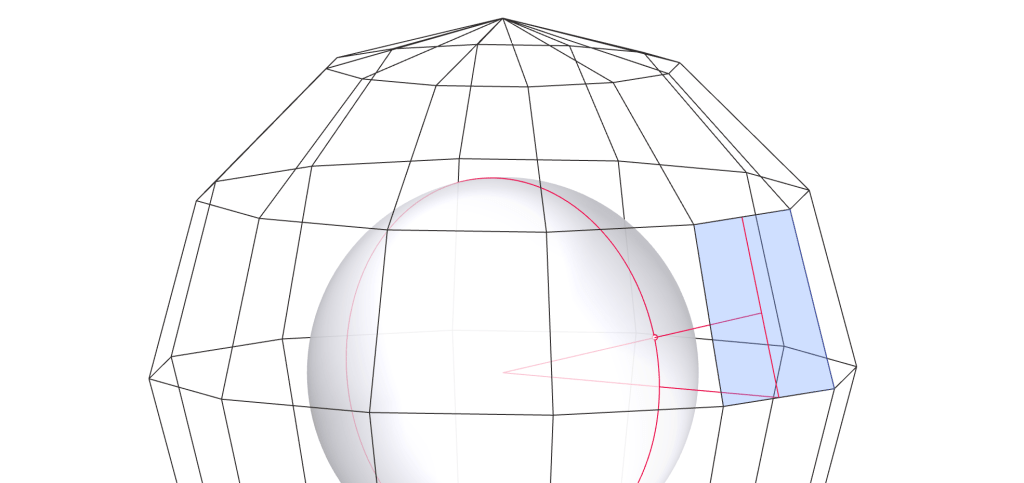 To model the lesser sphere, we consider the plane defined by its center and the median of one of the polyhedron’s faces in one of the larger rings (shown below in blue). The radius of the sphere tangent to that face is determined in this plane, considering the right triangle whose hypotenuse has the sphere’s center and the lower midpoint for vertices. The longest leg of this triangle is perpendicular to the median.