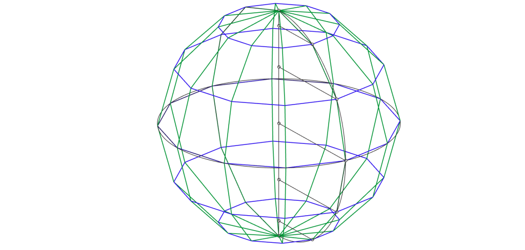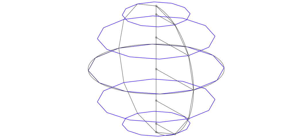The spheres were omitted in the second pair of images, and a second polygon (resulting from the rotation of the first polygon around axis y) is shown. The semicircle was divided into 2n.